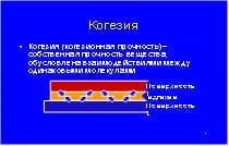 Когезия (когезионная прочность)– собственная прочность вещества; обусловлена взаимодействиями между одинаковыми молекулами. |